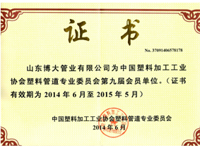 6月3日,公司加入中國塑料加工工業(yè)協(xié)會塑料管道專業(yè)委員會(CPPA),成為該委會會員單位。