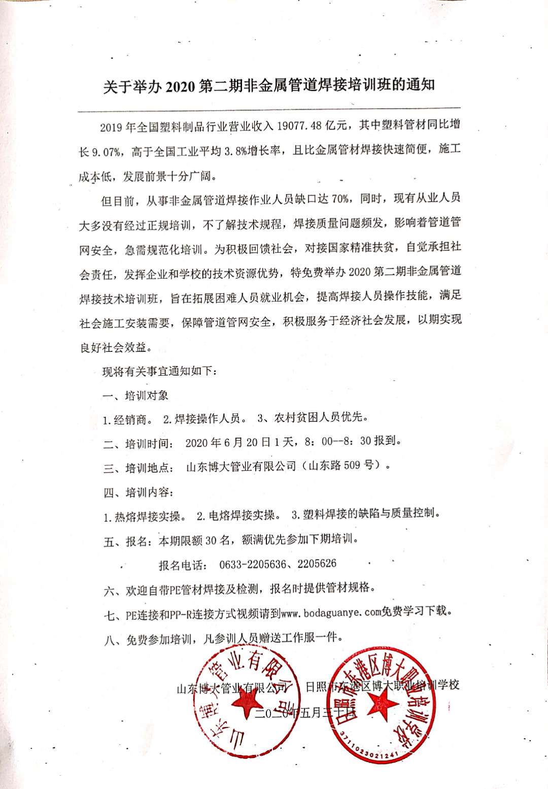 關(guān)于舉辦2020第二期非金屬管道焊接培訓(xùn)班的通知
