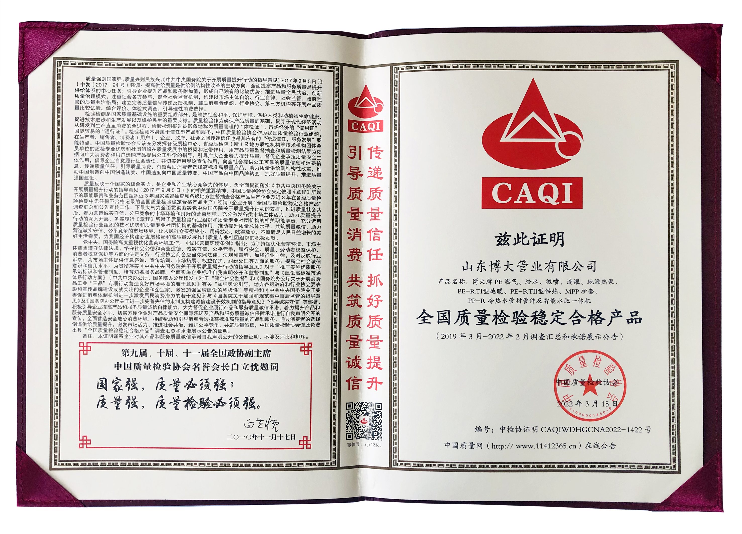 2022年3月15日,我公司生產(chǎn)的博源產(chǎn)品經(jīng)過中國質(zhì)量檢驗協(xié)會的評定,被評為“全國質(zhì)量檢驗信譽保障產(chǎn)品”、“全國質(zhì)量檢驗信得過產(chǎn)品”、“全國管材管件行業(yè)質(zhì)量領(lǐng)先企業(yè)”、“全國管材管件行業(yè)質(zhì)量領(lǐng)先品牌”、“全國產(chǎn)品和服務(wù)質(zhì)量誠信品牌”“全國質(zhì)量檢驗穩(wěn)定合格產(chǎn)品”、“全國產(chǎn)品和服務(wù)質(zhì)量誠信示范企業(yè)”7個榮譽稱號。