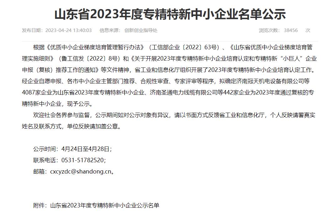 獲得“山東省2023年度專精特新中小企業(yè)”認定