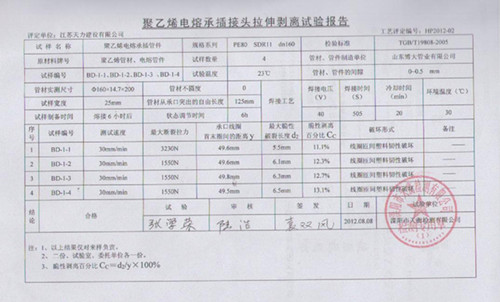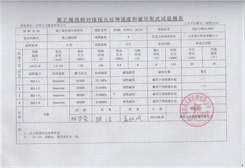 我公司與江蘇省大豐市時代管道燃氣有限公司展開良好合作,目前已在華光鎳業(yè)工地供PEØ200、職教中心工地供PEØ160。下圖為通過當?shù)貙I(yè)檢測部門試驗的試驗報告: