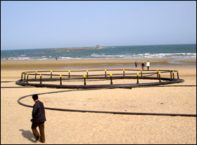 博大管業(yè)有限公司開(kāi)發(fā)了一種先進(jìn)的技術(shù),應(yīng)用于海水網(wǎng)箱養(yǎng)殖。用PE管道的抗腐蝕,比重小和不低于50年使用壽命的特點(diǎn),設(shè)計(jì)了環(huán)行管道浮子,它良好的浮力和堅(jiān)實(shí)的結(jié)構(gòu)以及超長(zhǎng)的使用壽命是傳統(tǒng)球型浮子無(wú)法比擬的。利用其良好的可焊接性能,在環(huán)型浮子上可以加上PE站竿和PE管扶手,浮子上搭上一周木板可以讓人站立行走,開(kāi)發(fā)海上旅游。